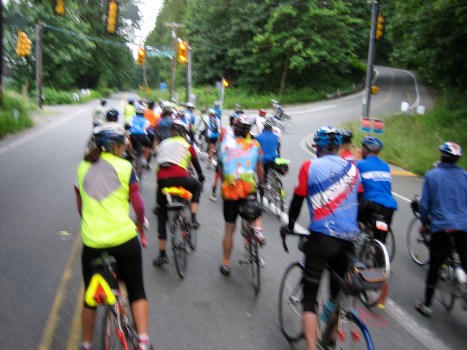 As with most group rides, there was a nice peleton at the beginning and then as we hit the first few hills, things begin to thin out. I was hoping I could make it to the overnight control before dark. But that was 224 miles out. Would that be possible, especially with the big climb over White Pass near the end? (Excuse the fussy image…low light conditions!)