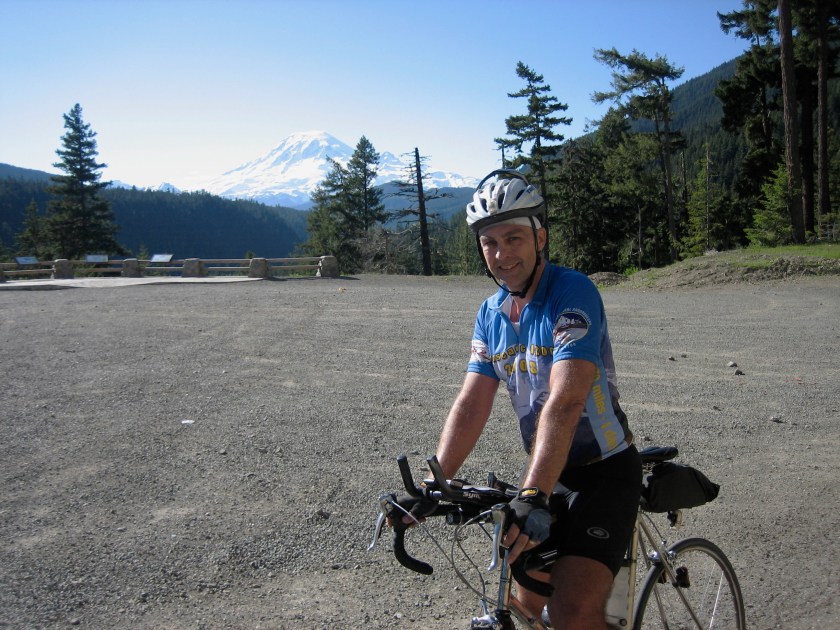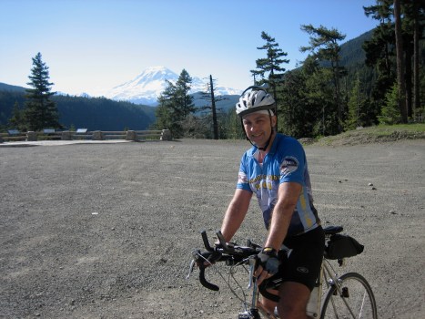 Previous Image Next Image Cascade1200_17 Don‘t just look ahead on climbs. The reverse views can be stunning too. Mike Sturgill with Mount Rainer in the distance.