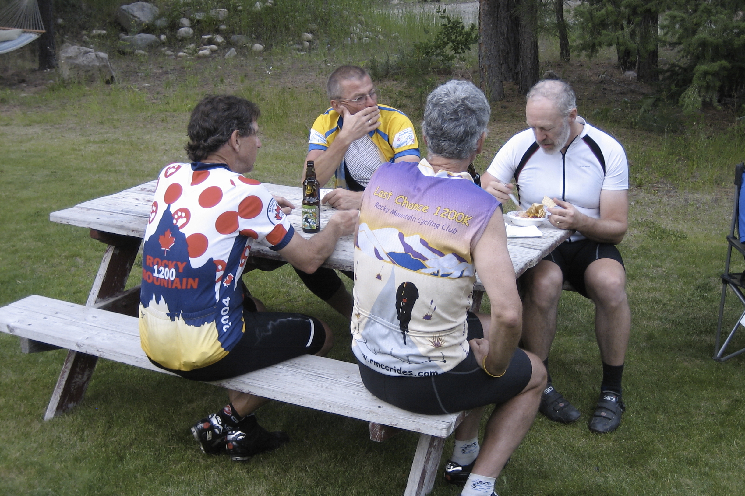 Previous Image Next Image Cascade1200_39 Kieth Nichol (L), Bob Bruce (R), Greg Courtney (sleeveless) and others catching up on war stories over supper.