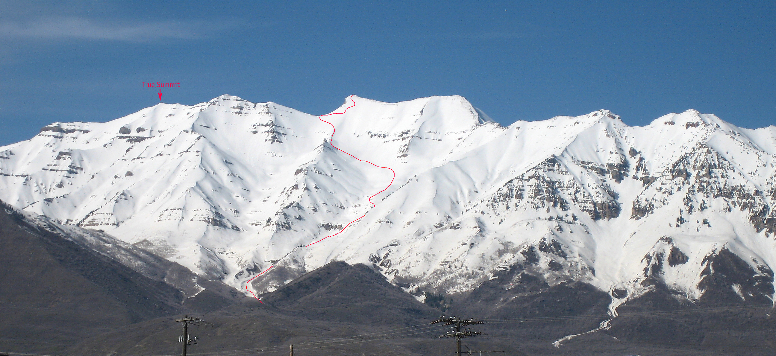 On my bucket list has always been to ski the west face of Mount Timpanogos in Utah. On May the 5th, 2011, a few guys from a local club were hiking (booting) and skiing to the top of the true summit (11,749 ft.) via Everest Ridge or the west face, as I call it. My friend Jim Knight invited me to do an alternate route the same day and ascend to the top of the East Summit via the Aspen Grove/Primose Cirque route (from the northeast side) and then descend the west face. I was worried about the descent route being too steep or icy for my limited ability, but as it turned out the maximum gradient was perhaps only 35 degrees and had many wide-open areas providing stress-free skiing. On previous trips, skiing down Primose Cirque had more challenging terrain and was frequently littered with avalanche debris. It took us about five hours to make the ascent to the southeast summit (approx. 11,722 ft.), arriving at about 11 a.m. We then descending off the windblown and crusty summit bloc and met the others at the main snowfield saddle, which sits above Emerald Lake (totally covered this year). At the saddle, I foolishly dropped a ski and it slid about 800 to 1000 feet down the wrong gully before it luckily came to a stop. I booted down to it and then rejoined the others as they descended.