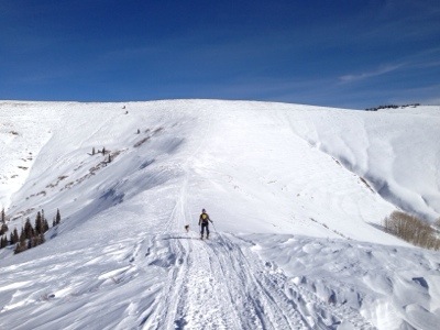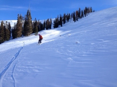 Today I went up with J.K. and skied from about the elevation of my house up to the Skyline Drive. We had bluebird weather, little wind and a short section (700 vert?) on the way down with some decent powder. We climbed some 3,800 feet and descended in about 4-1/2 hours. Because of the continuing high pressure system off in the Pacific, we had little wind, and then the snow was pretty thin in spots too.