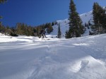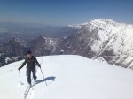 This year was different. I brought both boot and ski crampons (neither of which I used). We had 6 to 8 inches of fresh snow the prior night. We started up Rock Canyon on foot and proceeded to carry our skis for a few miles before there was enough snow to ski. Later we approached the peak from a N.W. ridge, which at times was difficult for me in the new powder, as my old Scarpa Laser boots didn’t provide the flex necessary in parts and I slipped backwards at times. We finally gained the main west ridge and uphill travel was easier. The descent down was very nice, with new snow over a firm base.