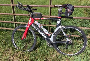 This is my 61cm Cervelo P3C time trial bike with mostly DuraAce components. It has a ceramic bottom bracket with FSA carbon fiber crank arms. It is used for solo (i.e. no drafting) events with less climbing (the gearing is much higher than my Trek Domane) and some 24-hour time-trial races. In November of 2014 I did my first 24-hour time trial race. I was using my Rocky Mountain Prestige with clip-on aerobars. But I unexpectedly found out that many of the others at that race had full-on time trial bikes, so afterwards, I decided to hunt one down. The next month I found a local deal on this 2008 frame and picked it up for a “song.” Components: I replaced the nice carbon fiber Profile Design Cobra Wing areobars with Syntace C3 alloy aerobars because the Cobra’s only mount below the bull-horn bars, placing them too low for my 6’4″ frame. I never did put handlebar tape on the carbon fiber bull horns and have found I kinda like the super smooth surface, even on long rides without pain in the palms of my hands (yes, I mostly the aerobars, but on long gradual climbs I set upright). I have added a Wolf Tooth 4-slot B-RAD Mounting Base to hold two water bottles cages on the down tube, a couple of eoGEAR bags (of course). Shown is a Chromag Trailmjaster LTD padded leather saddle (I was testing it but didn’t like it, I prefer the Brooks Team Pro like with my Trek. I have Issi SPD pedals (they offer models with longer spindles which accommodate my wonky left ankle which wants to rub the outside of  many crankarms), 52/39 chainring, 12/32 10-speed Ultegra cassette and a DT Swiss RC38C carbon fiber wheelset (20/24 bladed spokes, rim brakes, 38mm deep) with 25mm Continental 4000 S II tires. I sometimes move this wheelset over to my Trek Domane if I’m doing a route with less climbing and where I want a slightly more aero rig than the 28-spoke alloy DT Swiss RR 411 wheelset. It has horizontal drop-outs so I have to really crank down on the rear wheel quick-release skewer, otherwise the tire will rub on the drive-side chain stay…but because of the horizontal drop-out, I CAN use a moderately “fat” (25mm) tire.