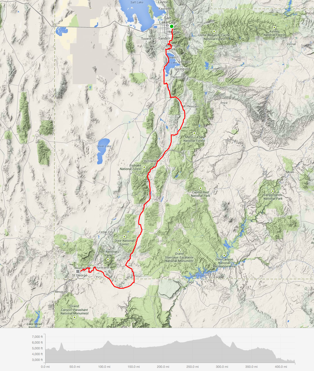 Route from SLC to Saint George. 425 miles & a moderate amount of climbing (approx. 15,000 ft.). My official time was 28:41.