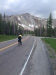 After a good breakfast, day two started at 3:30 a.m. with a monster climb (3,500 ft?) up to Snowy Range. At about 4:30 I started to pass many others, which had left in a big at 3:00. Eventually I came upon, Kerin Huber, a tough rider from Calif. She and I rode together the rest of the day. Near the summit of this climb, her speed dropped off and I continued on to get caught in a heavy hail/rain storm right at the treeless summit (a cold 38F). It hit when she was near a forest service restroom and ducked in there for protection from the elements. I quickly put on my helmet rain cover and climbed through it all. I already had on my Craft waterproof/breathable jacket. I was shivering so much on the descent, that my front wheel was wobbling a ton. Others reported having the same problem. I later stopped on the descent, down in the protection of trees and put on Rainlegs. I finally made to Centennial and stopped in a c-store to warm up and feed. From there we continued to Laramie and eventually over Rabbit Ears Pass (with thunder and lightening) and down to Steamboat Springs. Throughout the day, the weather alternated from warm and sunny to rainy and cold. Kerin and were constantly changing layers to keep up with the ever changing conditions. I arrived well before sunset and was able to get some much needed rest and food. The mileage that day was 199 miles.