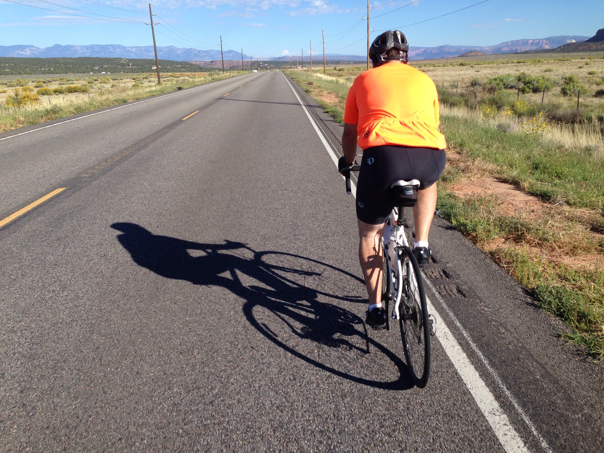 Day 2: At approx. 4 a.m. I sent off, in pursuit of Kerin, who had already left earlier in the morning. I caught her on the climb to Bryce Canyon and stayed with her most of the day. My favorite spot there was Fairyland Point, which looked great in the early morning light. From there we went north to the small town of Junction and then made the long ride south on U.S. 89 back to Kanab. I drafted off Kerin during much of the headwind as I was feeling a little bloated from a heavy sit-down breakfast earlier in the day. I also started feeling some saddle pain. After another stop in Panguitch, her stomach started feeling crappy, so she ordered me ahead and not to wait for her…which I did. I saw her later in the evening near Coral Pink Sand Dunes state park. I arrived back in Kanab at about 10:00 p.m. She rolled in about an hour later. The rest of the group, which had stayed together, came in about 2 a.m.