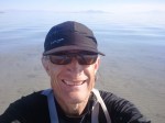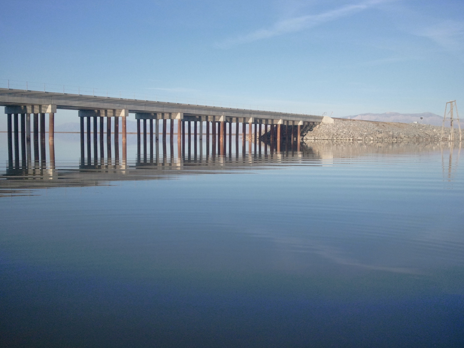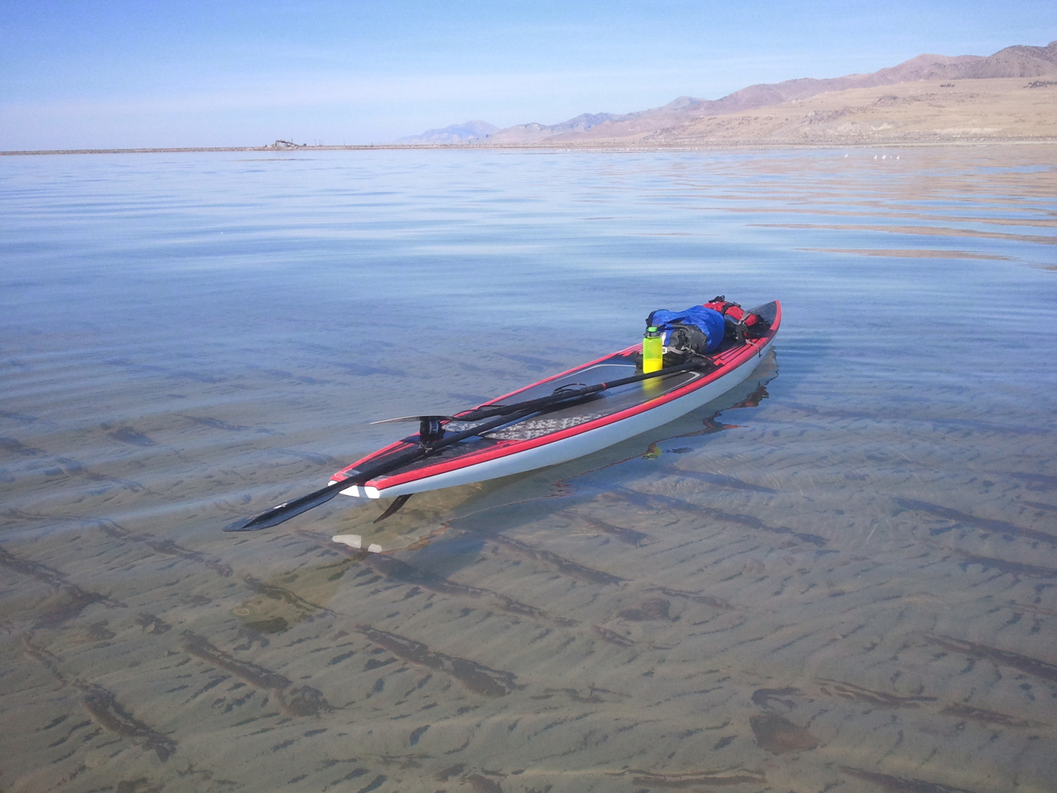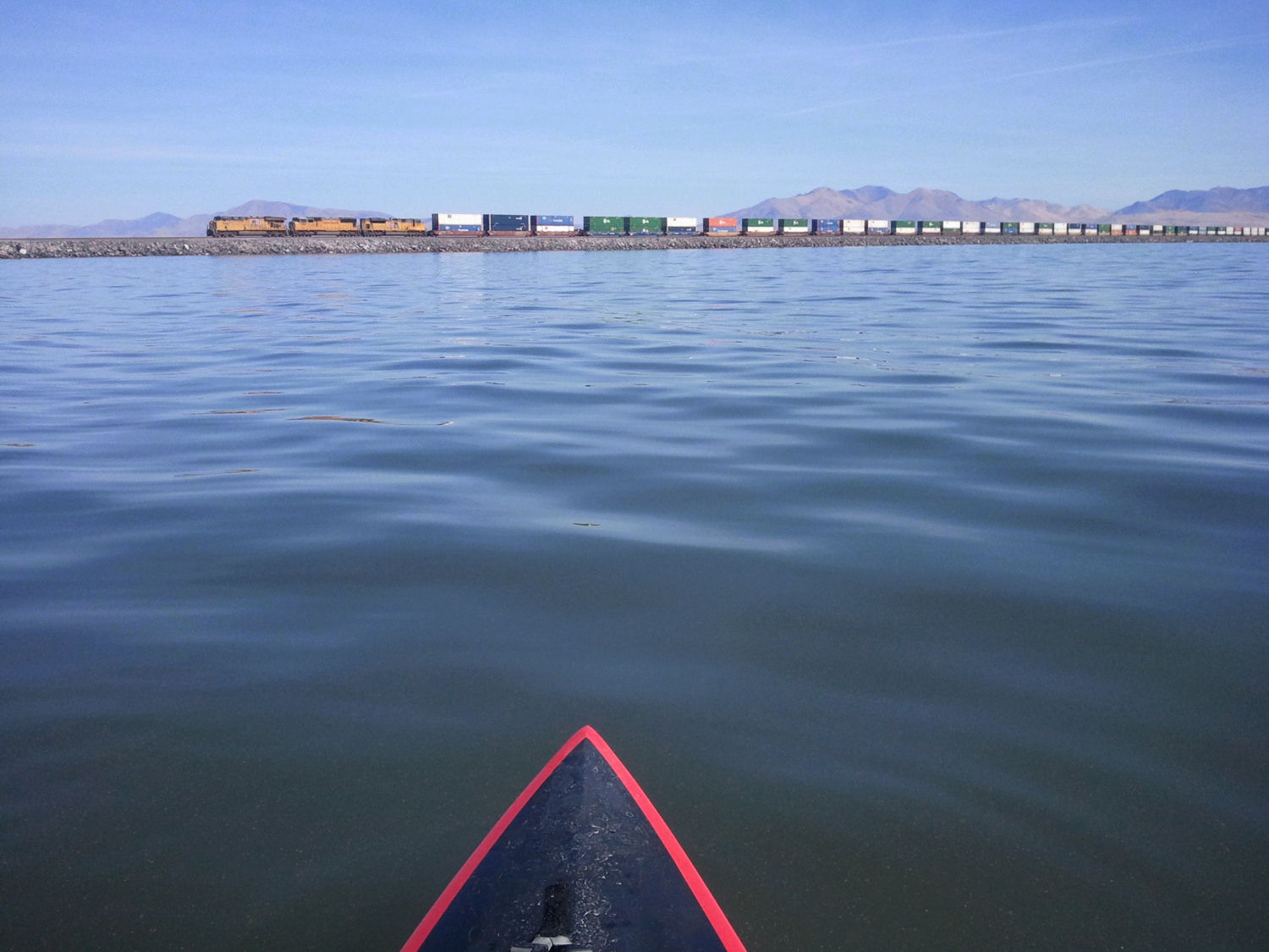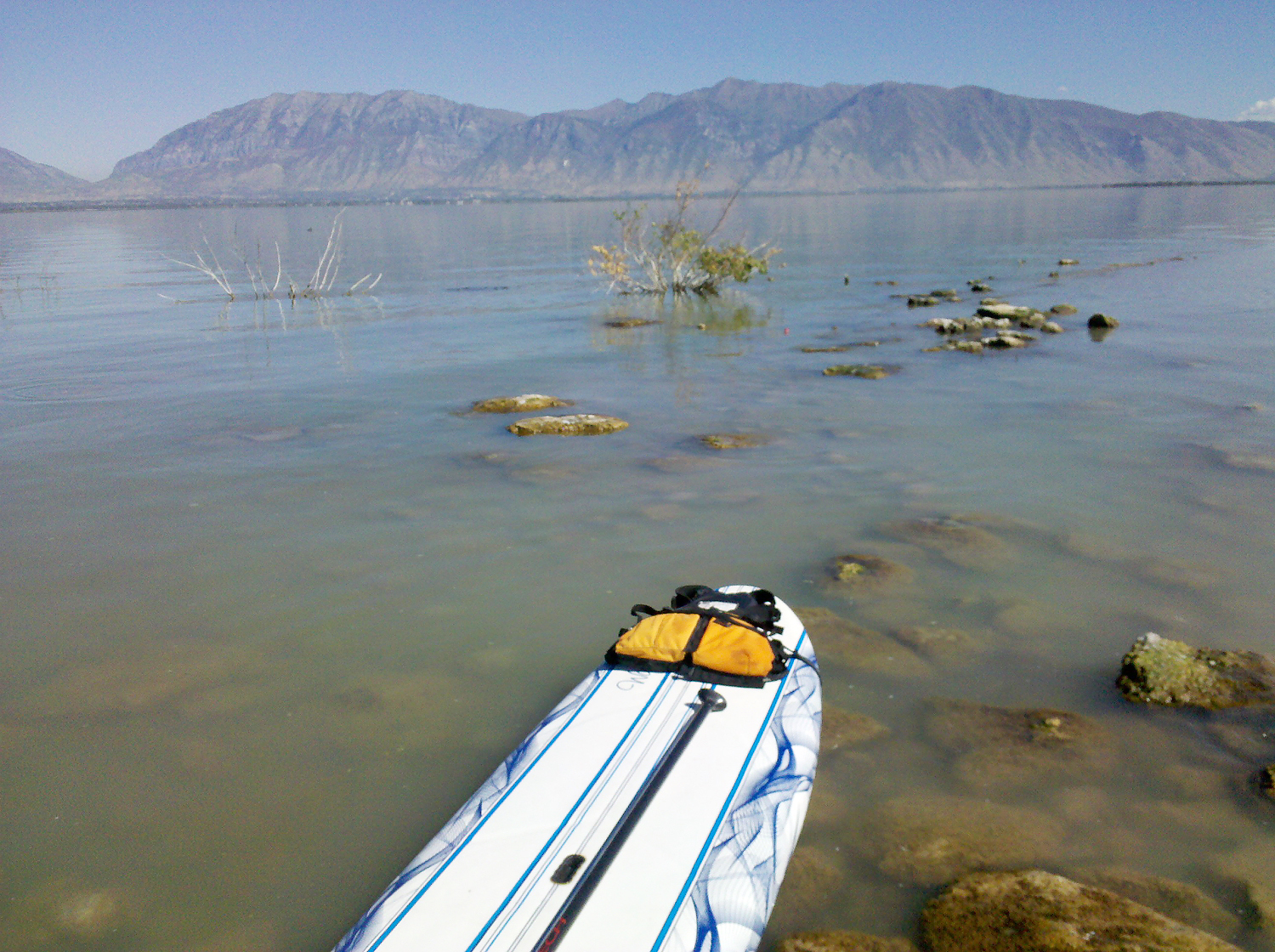 On October 9th, 2012 I did a crossing of the width of the Great Salt Lake on a stand-up paddle board. It was my understanding that this was the first-ever crossing of the lake via SUP, but I have been told since then, that other groups have done it previously (although I have not seen any GPS downloads or blog reports confirming it). Perhaps this was the first ever solo, unsupported crossing. I did this 28 mile starting just after 10 a.m. The ambient temps during the day ranged from about 50F to 68F with a water temperature of 62F. I specifically picked this day as the forecast had a wind of only 6 MPH in the morning decreasing to 1 or 2 MPH by the afternoon — perfect conditions for a safe trip on such a body of water. My moving time was 6:54 for a total travel time of about 7:41. I traveled from the west near the railroad causeway, which crosses this lake in a east/west direction. This was for safety, so that if there were any issues, I could paddle towards it and latch on. This time of year, I went about as far east as I could go before running into the dreaded biotherms or before hitting very shallow waters and unable to paddle any further. In fact, the last three of four miles, I had to stand forward on my board while paddling as my rear fin was dragging on the bottom of the lake!