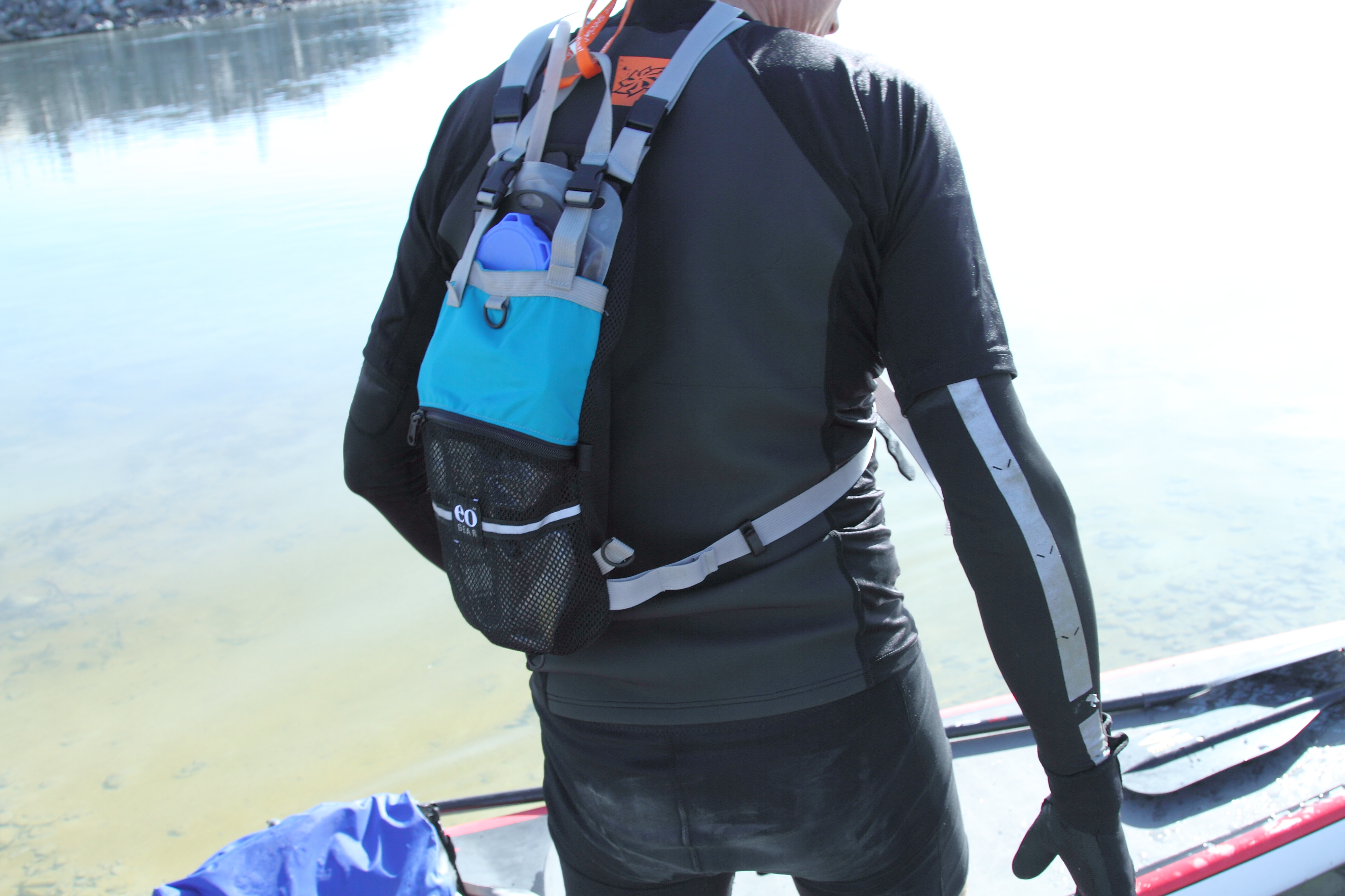 > I was testing a new SUP-specific hydration backpack which I’m designing for release next spring (eoGEAR Inc.). In it I used a 2-liter bladder and later switched out to a 1.5-liter bladder after I consumed the first one. Both were filled with Cytomax. In my dry bag I also had a liter of Hammer Perpeteum and two liters of water. I had way more fluids that I needed.