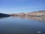 My first run on this new board at a local reservoir was in awful conditions with 15-18 MPH cold winds (ambient temps about 45F) and chop. While I was boarding, I could see the blowing snow in the mountains, just a few miles to the east the reservoir which I was on (Gunnison Reservoir). I fell off the board once, while trying to navigate in a cross wind. I finally sat down and paddled for a while until the wind subsided a bit. I found this board to be a bit less stable than the Wave Storm board, but that is to be expected because of the v-shaped nose. With the Wave Storm, while paddling in flat water I could comfortably turn my head around and look at the stern without falling over. With the ISD board, I have to be VERY careful making this move, or I’d be in the drink. With this board, I have found that I like to place my feet at a slight angle against the outer edges of this “bathtub wall” for maximum stability and comfort. Despite having an angled deck, the water still builds up a little in the recessed pad where one stands. I did find that the displacement nose of the Isle board fared better in chop (waves caused by wind) than the planing nose of the WS. The WS nose kept slapping up and down, whereas the ISD just sliced through it more easily.